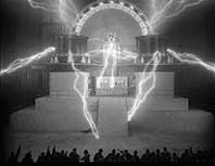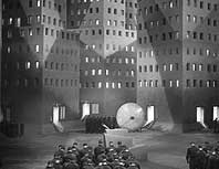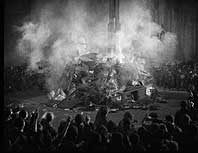 Gefaßt wird aber nicht Maria, sondern ihre unheilbringende Doppelgängerin. Die Arbeiter verbrennen die Maschine, während Maria gemeinsam mit Freder die Kinder des Volkes rettet. Bei einem brutalen Kampf zwischen Freder und Rotwang wird der Erfinder getötet. Durch die Geschehnisse sind die Bewohner von Metropolis zunächst geeint, der Weg scheint frei für eine Welt ohne Klassenunterschiede. | ||