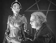 Um Maria auszuschalten, beauftragt Joh Fredersen den Erfinder Rotwang. Dieser erschafft einen künstlichen Menschen, der die Züge Marias trägt, um zu Kampf und Zerstörung aufzurufen. Gleichzeitig erhofft sich Rotwang, der Freder haßt, daß seines Todfeindes Sohn an der Liebe zu Marias künstlicher Doppelgängerin zugrunde gehen werde. Zunächst gelingt der Plan, von der lasziven Roboter-Maria aufgestachelt, revoltieren die Arbeiter und verwüsten die Arbeiterstadt. Als sie aber erkennen, daß durch ihre Taten die Arbeiterstadt überschwemmt wird und damit ihre Kinder in Gefahr sind, machen sie sich wutentbrannt auf die Suche nach Maria. | ||